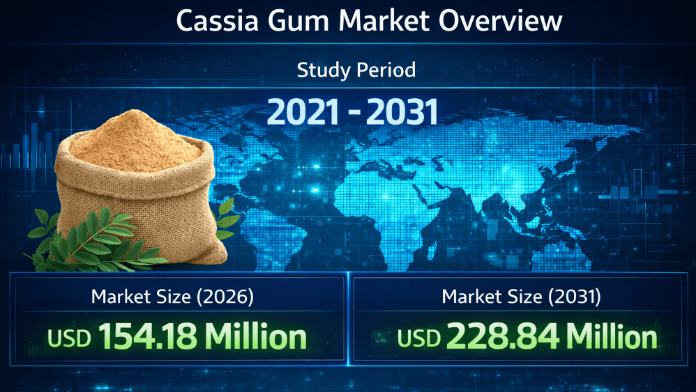 The global Cassia Gum Market size is forecast to increase from USD 154.18 million in 2026 to USD 228.84 million by 2031, expanding at a CAGR of 8.22% over the forecast period. Market expansion is supported by rising adoption across food processing, pharmaceuticals, personal care, and animal nutrition, driven by the shift toward plant-based, biodegradable, and clean-label hydrocolloids.