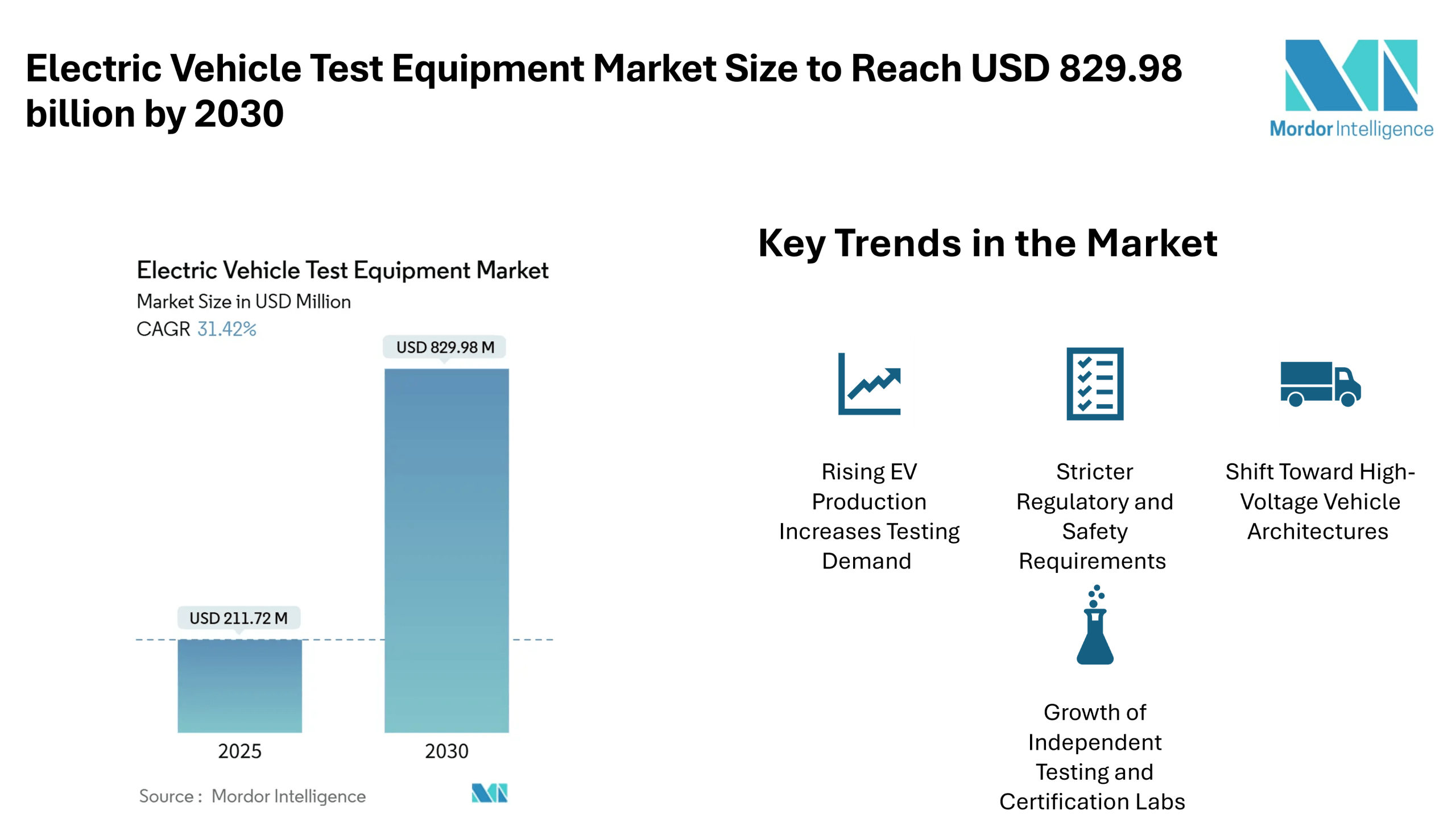 The global Electric Vehicle Test Equipment market size is witnessing rapid growth as electric vehicle production continues to scale worldwide. According to Mordor Intelligence, the market was valued at approximately USD 211.72 million in 2025 and is projected to reach around USD 829.98 million by 2030, registering strong growth over the forecast period. This expansion is driven by increasing EV model launches, rising adoption of high-voltage vehicle architectures, and the need for advanced validation of batteries, power electronics, and charging systems.