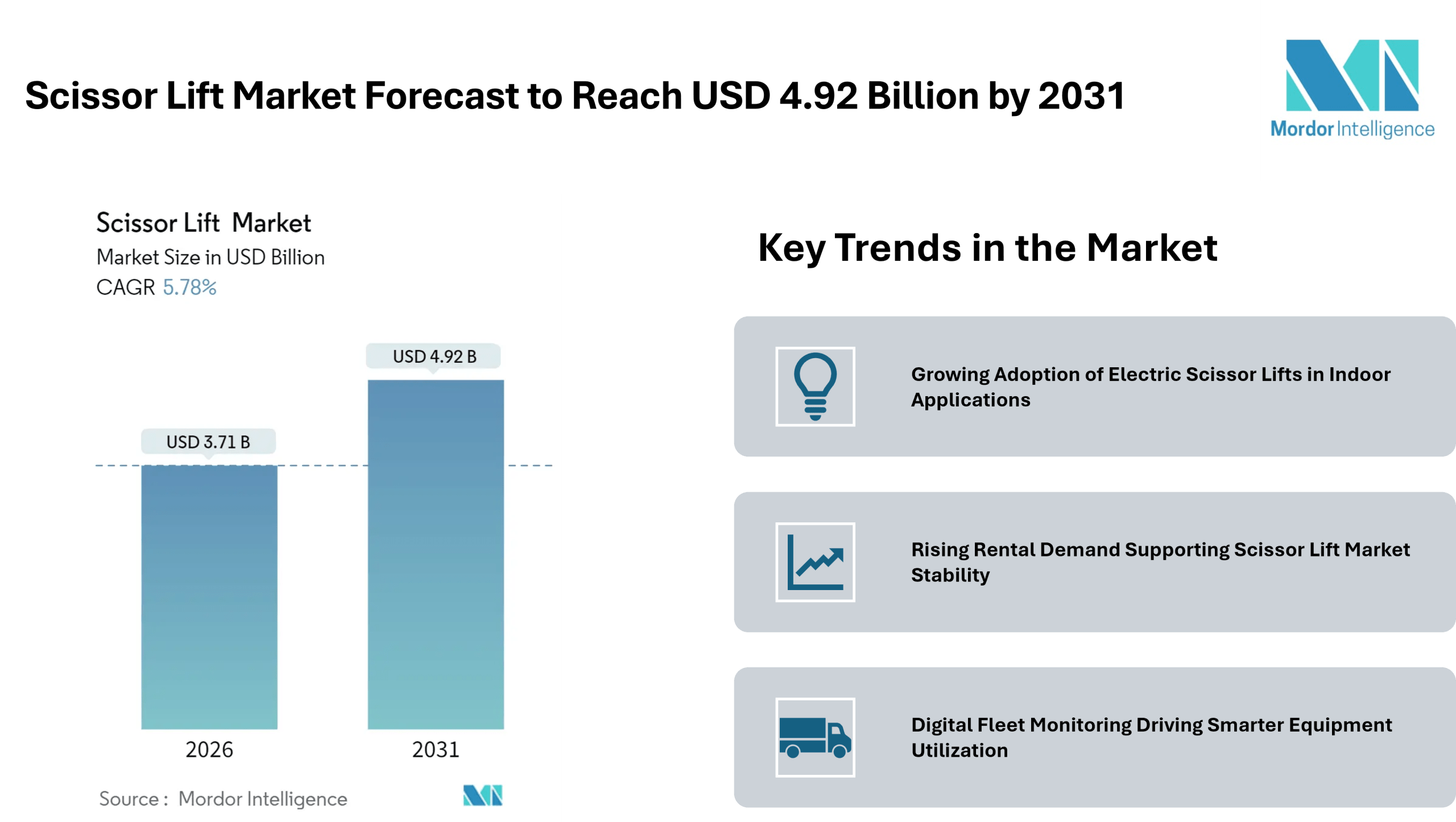 According to Mordor Intelligence, the scissor lift market size at USD 3.71 billion in 2026, and is projected to achieve USD 4.92 billion by 2031. This outlook reflects consistent scissor lift market growth supported by infrastructure development, warehouse expansion, and the growing preference for rental-based access equipment.