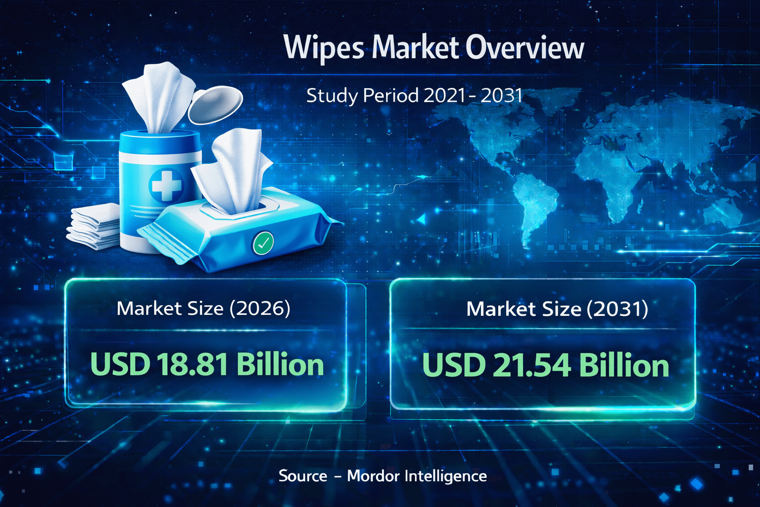 The global wipes market size was valued at USD 18.81 billion in 2026 and is projected to reach USD 21.54 billion by 2031, reflecting steady expansion during the forecast period. The consistent rise in hygiene awareness, evolving consumer lifestyles, and growing adoption of ready-to-use cleaning solutions are strengthening overall wipes market growth.